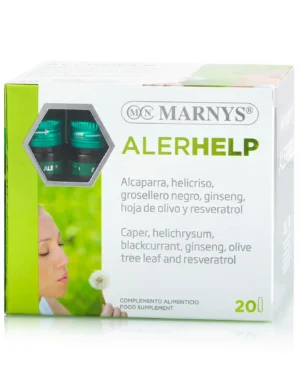 Alerhelp din gama MARNYS® este un Supliment Lichid Premium. Formula sa Complexă include 6 Ingrediente Active (Capere, Coacăze Negre, Ginseng, Planta Curry, Frunze de Măslin, Resveratrol) și Contribuie la Ameliorarea Reacțiilor Alergice precum: Rinită, Urticarie, Eczemă, Conjunctivită sau Astm. Produs în Spania la Cele Mai Înalte Standarde GMP, din Plante Naturale. Nu conține gluten, lactoză sau organisme modificate genetic.