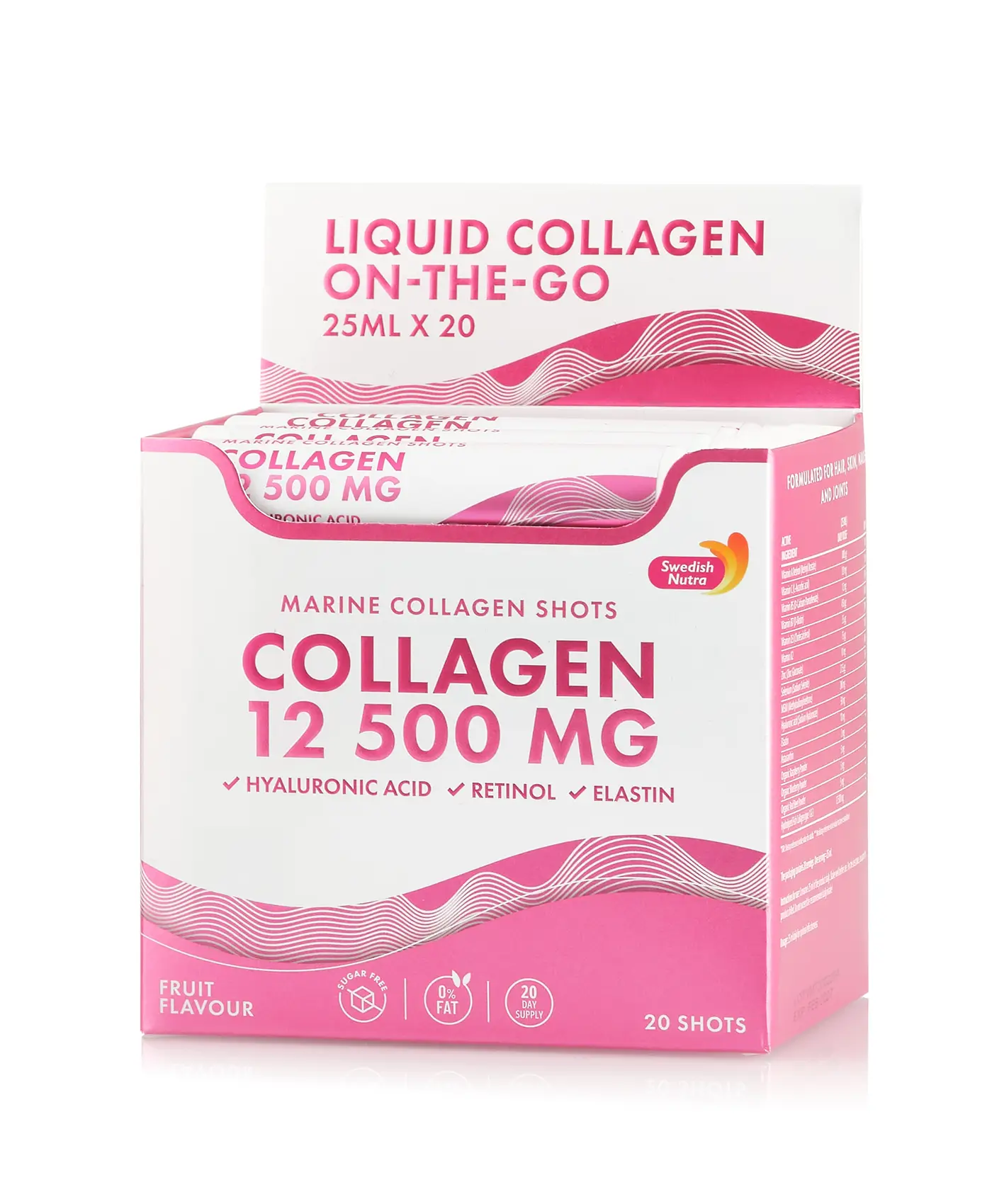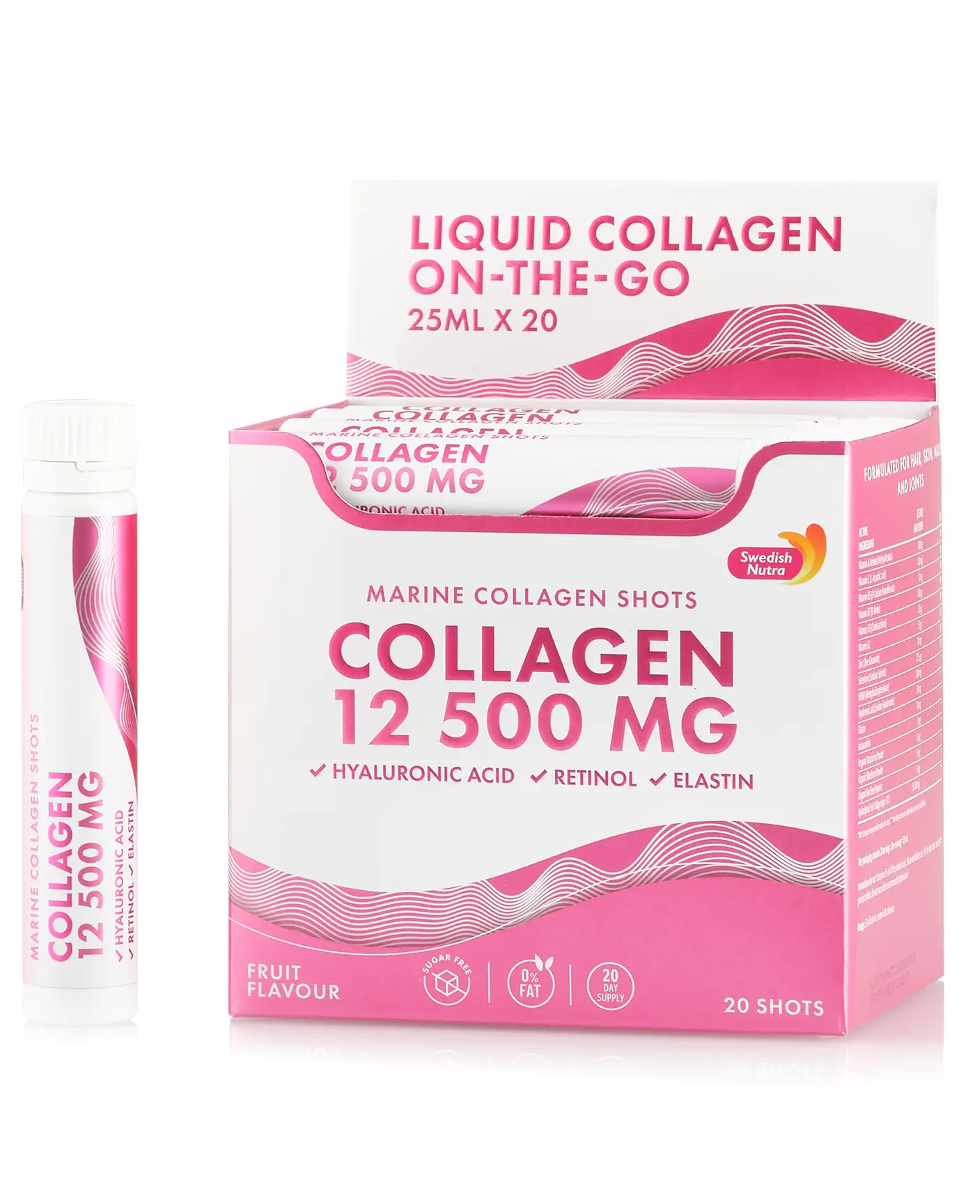 Supliment lichid Super-Concentrat pe baza de Colagen Marin Hidrolizat (din peste) cu 12.500 mg la doza zilnica. Formula unica este imbogatita cu Acid Hialuronic, Retinol, Elastina, Zinc, MSM, Vitamine si Mix de fructe si legume pentru sanatate si frumusete, avand multiple beneficii pentru sanatate, date de fiecare ingredient in parte. Cutia cu 20 Fiole Buvabile ajunge pentru 20 de zile de administrare si poate fi transportata cu usurinta in orice bagaj. Aroma si culoarea sunt 100% Naturale. Produs premium fabricat in Suedia la Cele mai Inalte standarde de calitate.