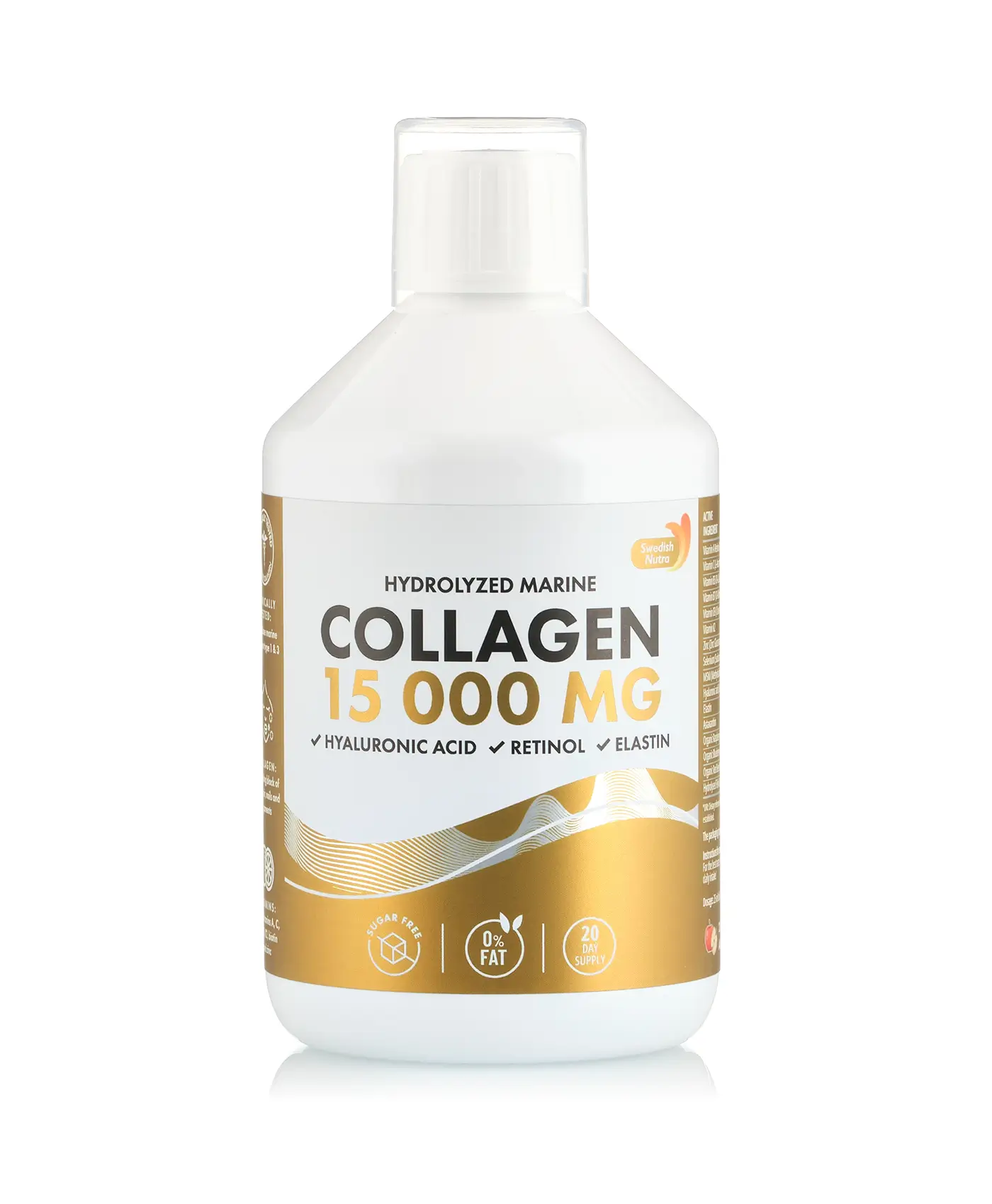 Iti prezentam o noua formula premium cu Colagen Lichid Hidrolizat Tip 1 si 3 + Acid Hialuronic + Retinol + Elastina + Zinc + Vitamine + Minerale pentru o piele vizibil intinerita, cu multiple ale beneficii pentru frumusetea parului, unghiilor si sanatatea articulatiilor. Formula lichida asigura cea mai mare concentratie de Colagen Marin Hidrolizat de pe piata 15.000 mg la doza zilnica, absorbtie maxima si asimilare eficienta. Aroma si culoarea sunt 100% Naturale. Nu contine zahar.