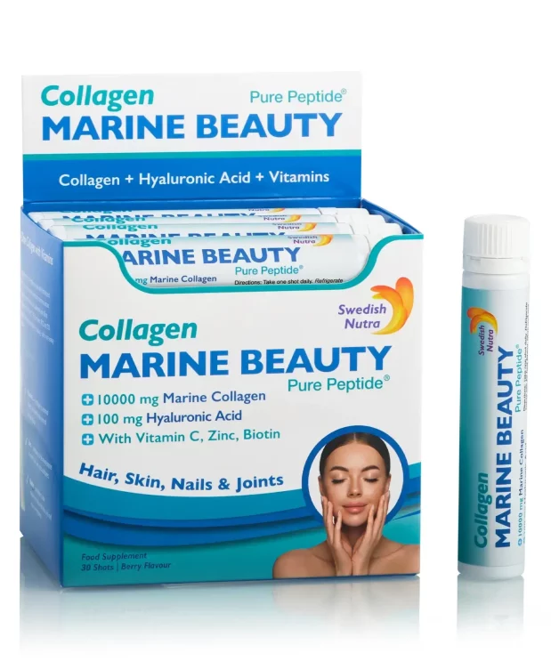 Frumusețea adevărată provine din interior, iar cu aportul corect de nutrienți, poți evidenția cu ușurință frumusețea ta naturală. Marine Beauty este un produs inovator care combină eficient beneficiile a patru formule destinate îngrijirii părului, pielii, unghiilor și articulațiilor, într-un singur supliment. Fiecare doză zilnică furnizează 10.000 mg de colagen marin de tip 1 și 3, 100 mg de acid hialuronic, 50 mg de siliciu, 150 mcg de biotină și un amestec de alte 8 vitamine și minerale, contribuind astfel la obținerea unei pieli catifelate, reducerea ridurilor și revitalizarea părului.