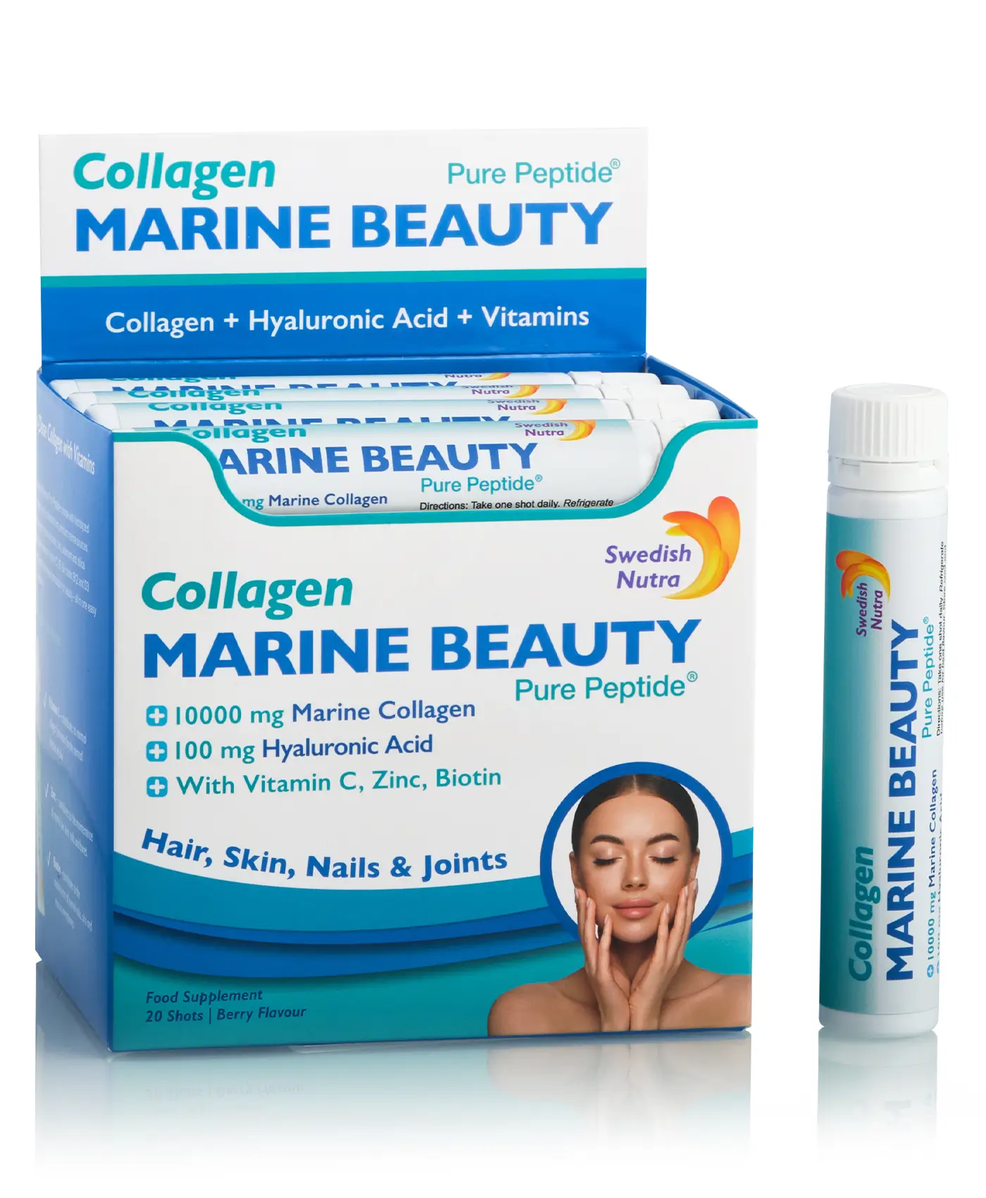 Frumusețea vine din interior, iar cu nutrienții potriviți, îți poți evidenția cu ușurință frumusețea naturală. Marine Beauty, un nou produs inovativ cu concentrații bogate de ingrediente nutritive, combină acțiunea a 4 produse pentru păr, piele, unghii și articulații într-unul singur. Doza zilnică conține 10.000 mg colagen marin de tip 1 și 3, 100 mg acid hialuronic, 50 mg siliciu, 150 mcg biotină și un adaos de alte 8 vitamine și minerale pentru o piele fină, riduri estompate, și păr strălucitor.