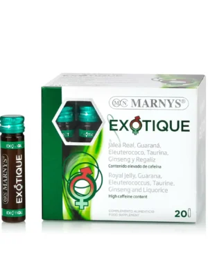 EXOTIQUE din gama MARNYS® este un Supliment Nutritiv sub formă de Fiole Buvabile. Conține 4 Energizanți Naturali (Lăptișor de Matcă, Ginseng Siberian, Panax Ginseng, Guarana) + Taurină. Are un Efect Tonic și Revigorant. Stimulează Nivelul de Energie al organismului și Reduce Stările de Oboseală și Extenuare. Produs în Spania la cele mai înalte Standarde GMP.