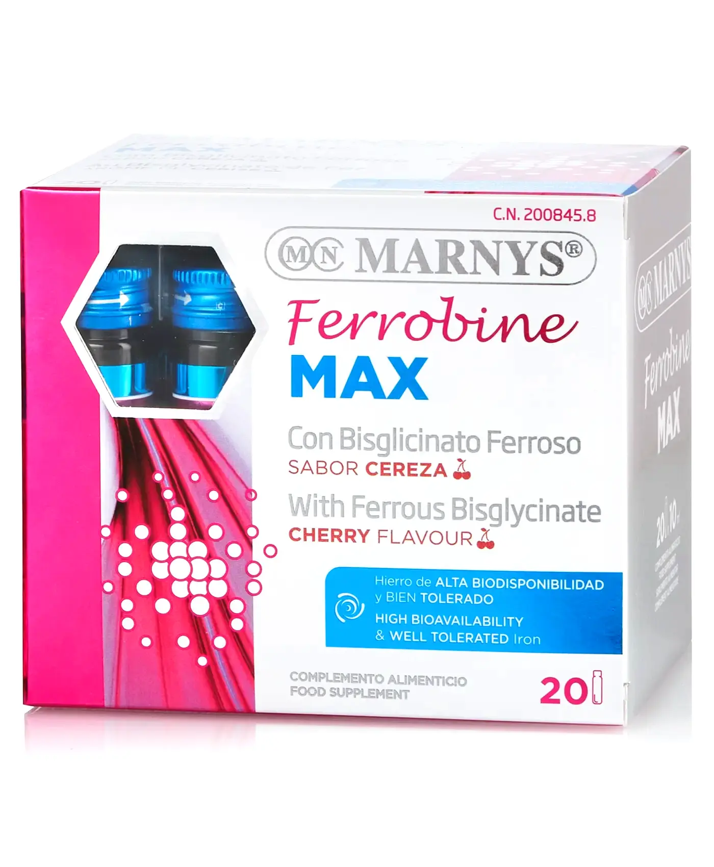 Ferrobine Max din gama MARNYS® este un Supliment Lichid de Calitate Premium care Fortifică Organismul și Reduce Stările de Oboseală și Extenuare. Formula sa Inovatoare conține Bisglicinat de Fier, Zinc si Complexul de Vitamine B (B1, B2, B9, B12). Produs cu o Rată de Absorbție foarte Ridicată. Produs Vegan, Fabricat în Spania la cele mai Înalte Standarde GMP. Gust Delicios de Cireșe! Nu conține lactoză sau organisme modificate genetic.