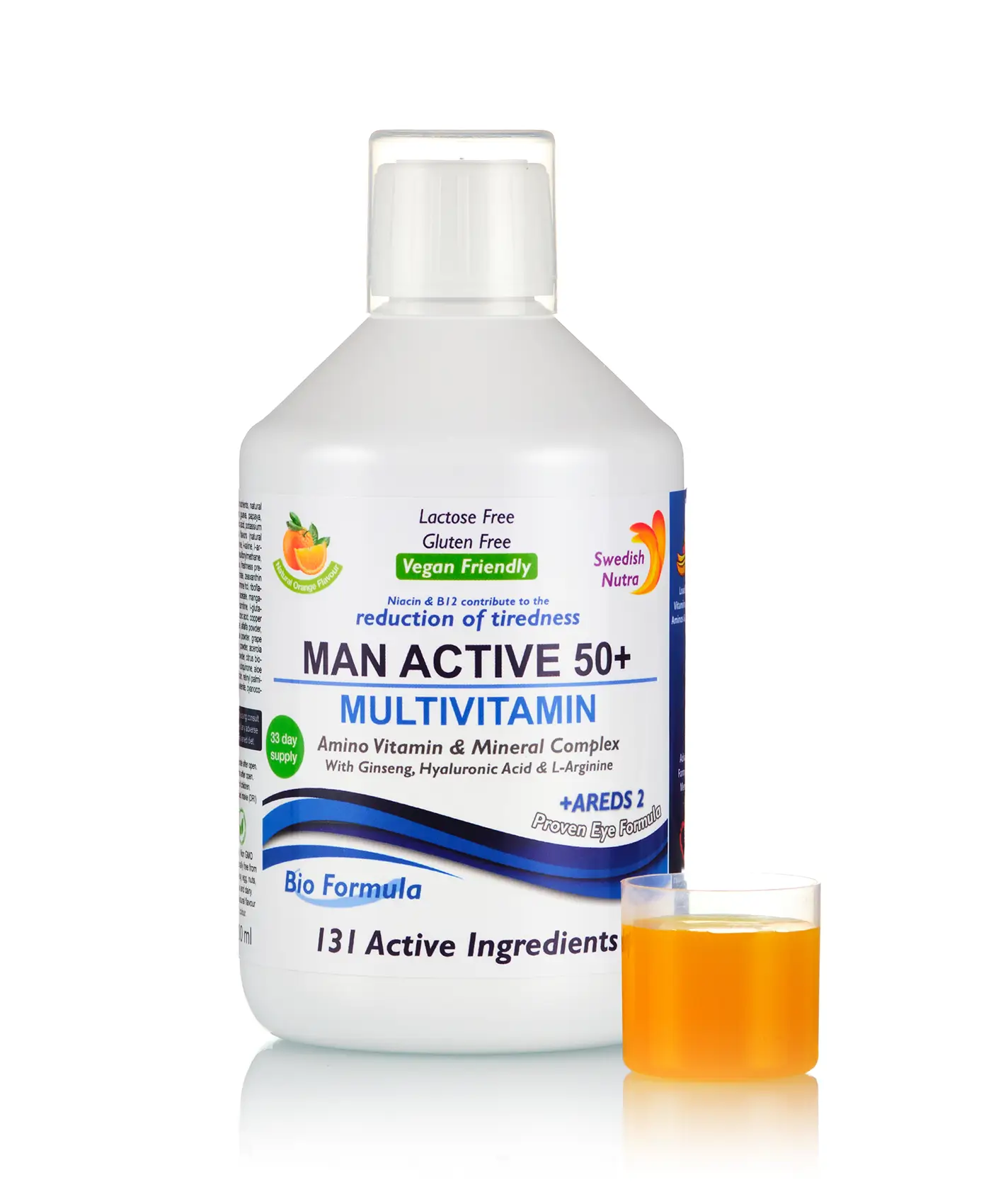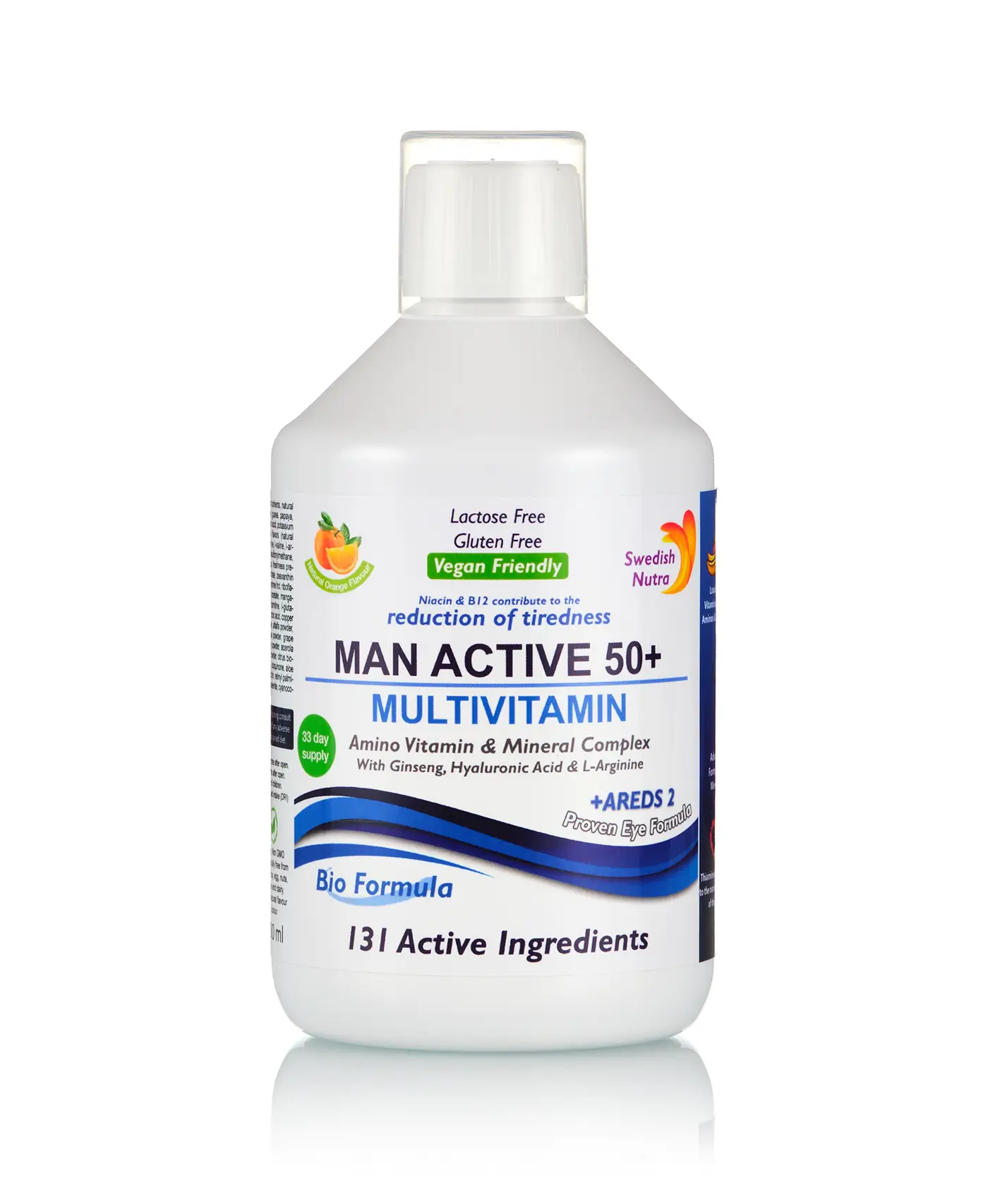 Complexul de Multivitamine Lichide MAN ACTIVE 50+, Produs în Suedia după o Formulă Unică include: 13 Vitamine Esentiale, 85 Minerale, 10 Aminoacizi + Bio Active Life Blend. Datorită formei lichide asigură o Absorbție Maximă, Asimilare Rapidă și Eficiență 100%. Atât aromele folosite cât și culoarea sunt 100% Naturale. O sticlă are 500ml și ajunge pentru 33 de zile de tratament. Produs Vegetarian. Nou în România!