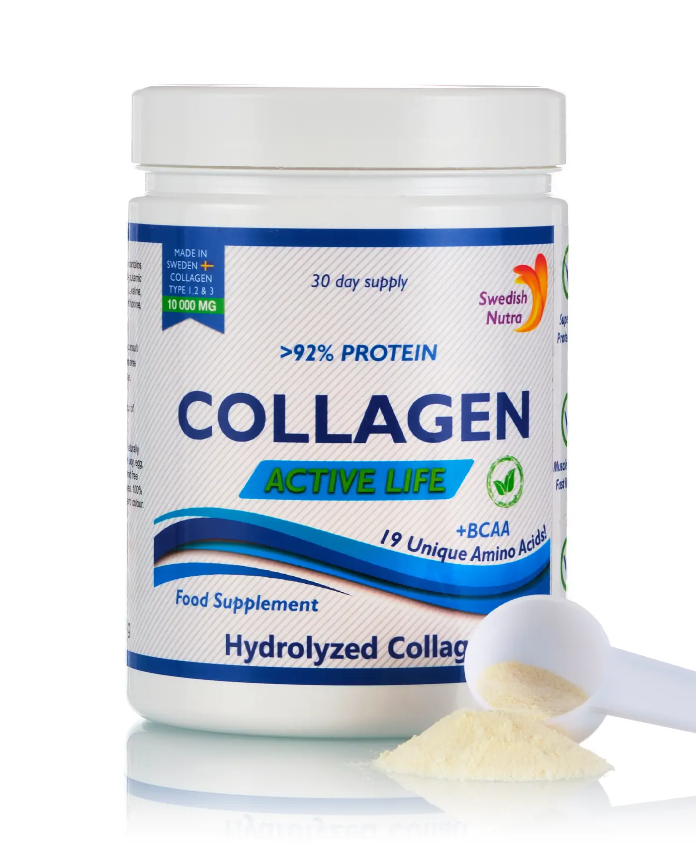 Peptide de Colagen Hidrolizat Tip 1, 2 și 3 Super Concentrat, Sub Formă de Pulbere cu 10.000 Mg per servire. Conține toate cele 3 tipuri de Colagen. Cutie Mare cu 300g pentru 30 de zile de tratament. Produs de Calitate Premium Fabricat în Suedia, 100% Natural, inclusiv culoarea si gustul. Fără adaos de alte ingrediente. Este Potrivit și pentru Persoanele cu Diabet neavând nici un îndulcitor.